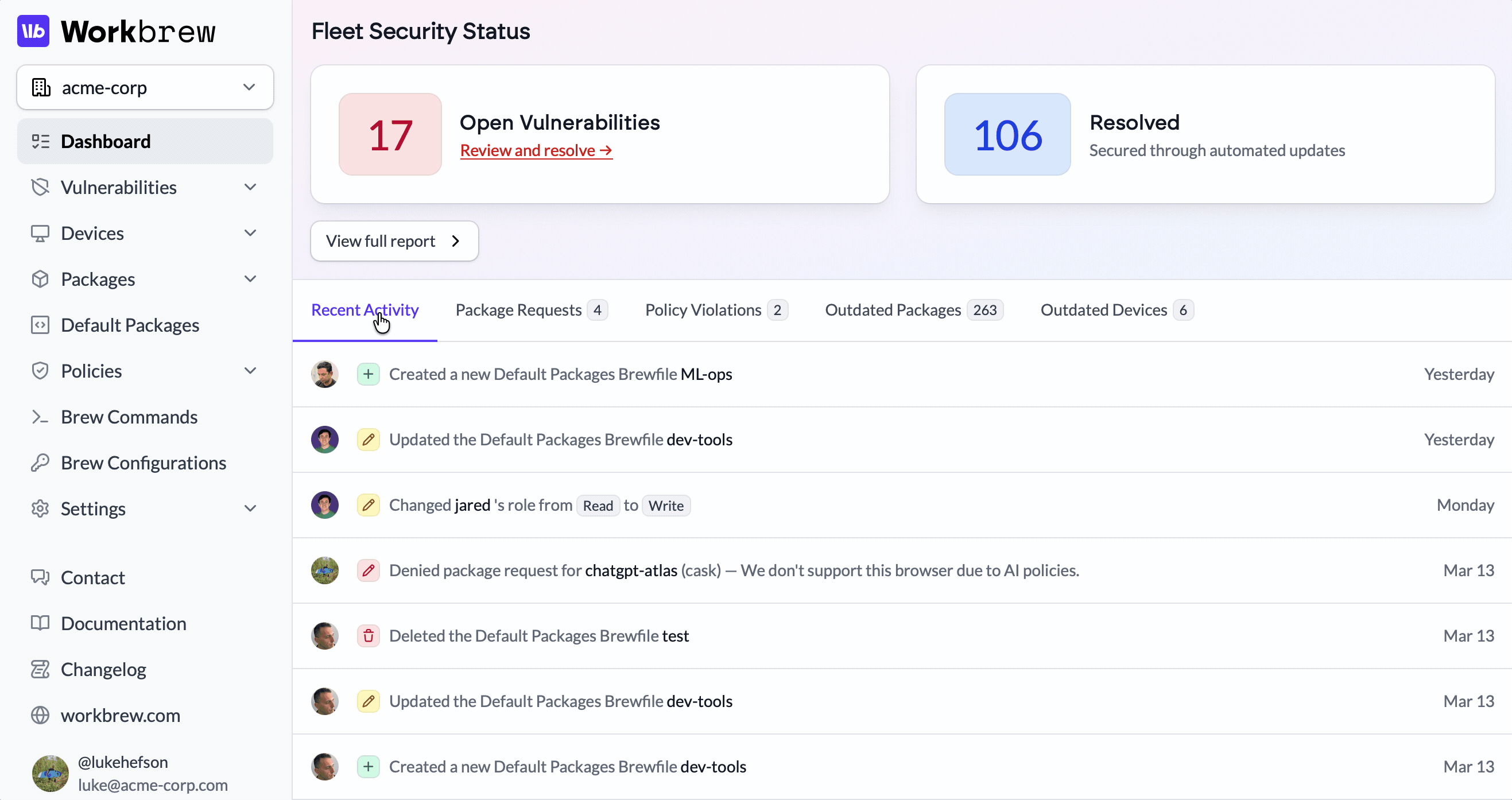 For security teams, compliance posture is now a first-class view rather than something assembled from separate reports. Policy status, package versions, and risk indicators are consolidated to support both day-to-day monitoring and the point-in-time snapshots that audit processes require.