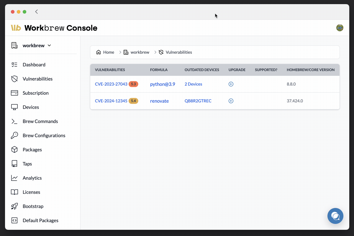 IT and Security professionals need clear, real-time visibility into the systems they manage. Workbrew delivers comprehensive insights into the use of brew within your organization, offering a centralized view of your software supply chain. It’s easy to track installed packages, versions, third-party sources, software licenses, and potential vulnerabilities — all in one place.