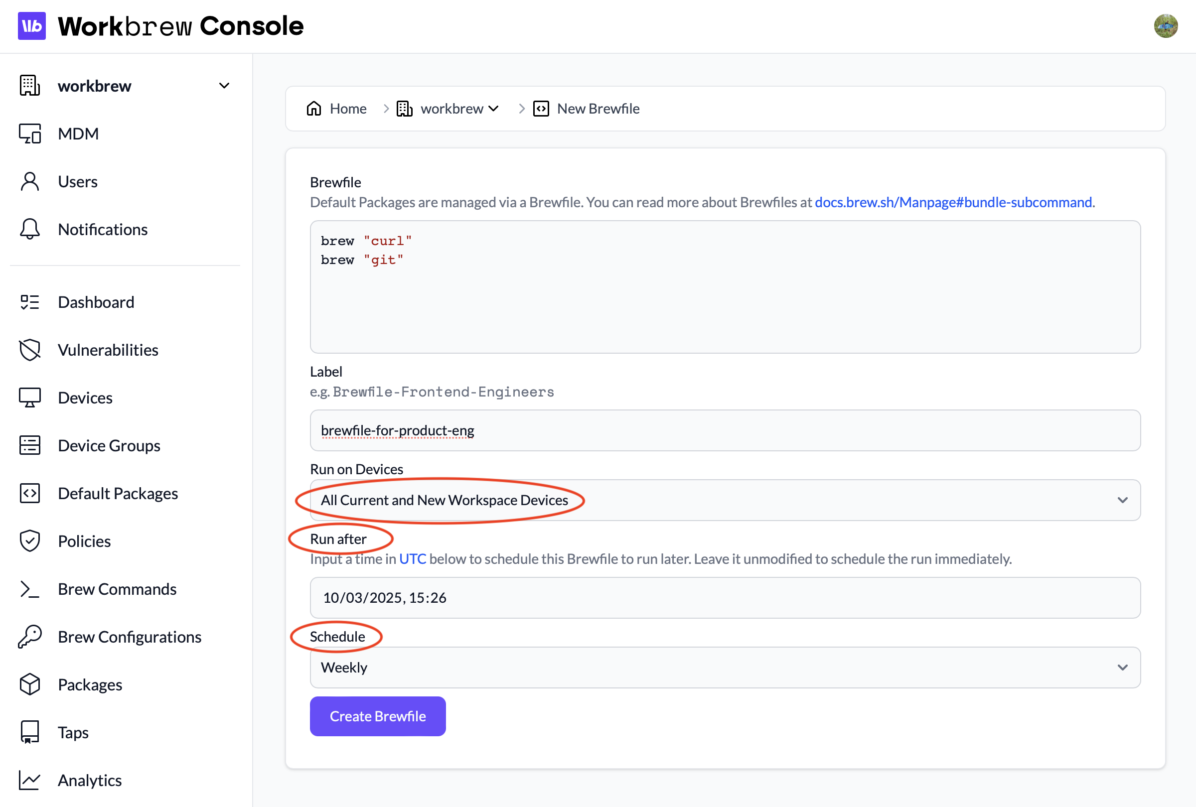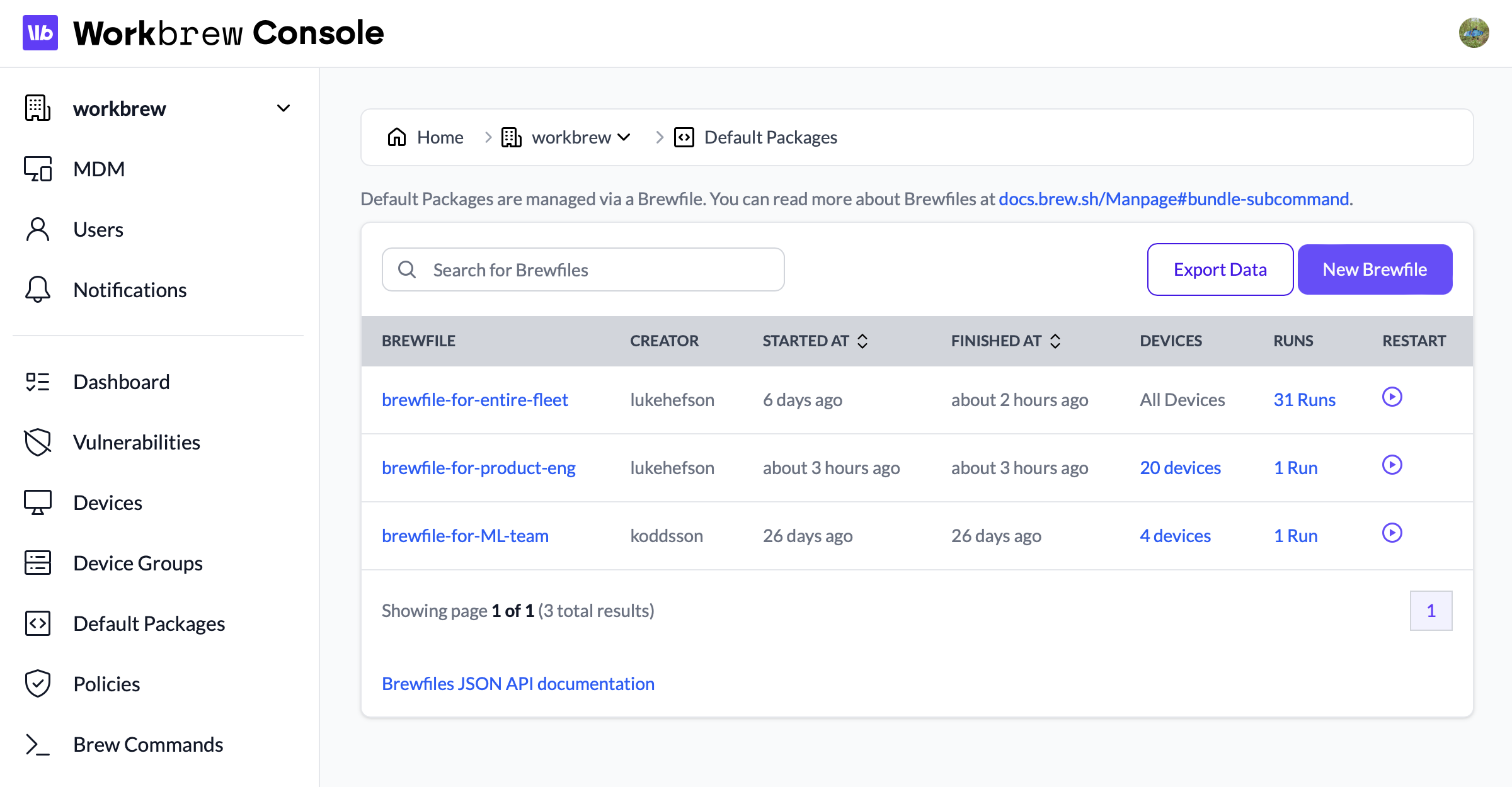 Workbrew now supports multiple lists of Default Packages, allowing admins to create any number of custom Brewfileswhich can then be targeted at either a team of people’s devices (via Device Groups), an individual device or your entire fleet.