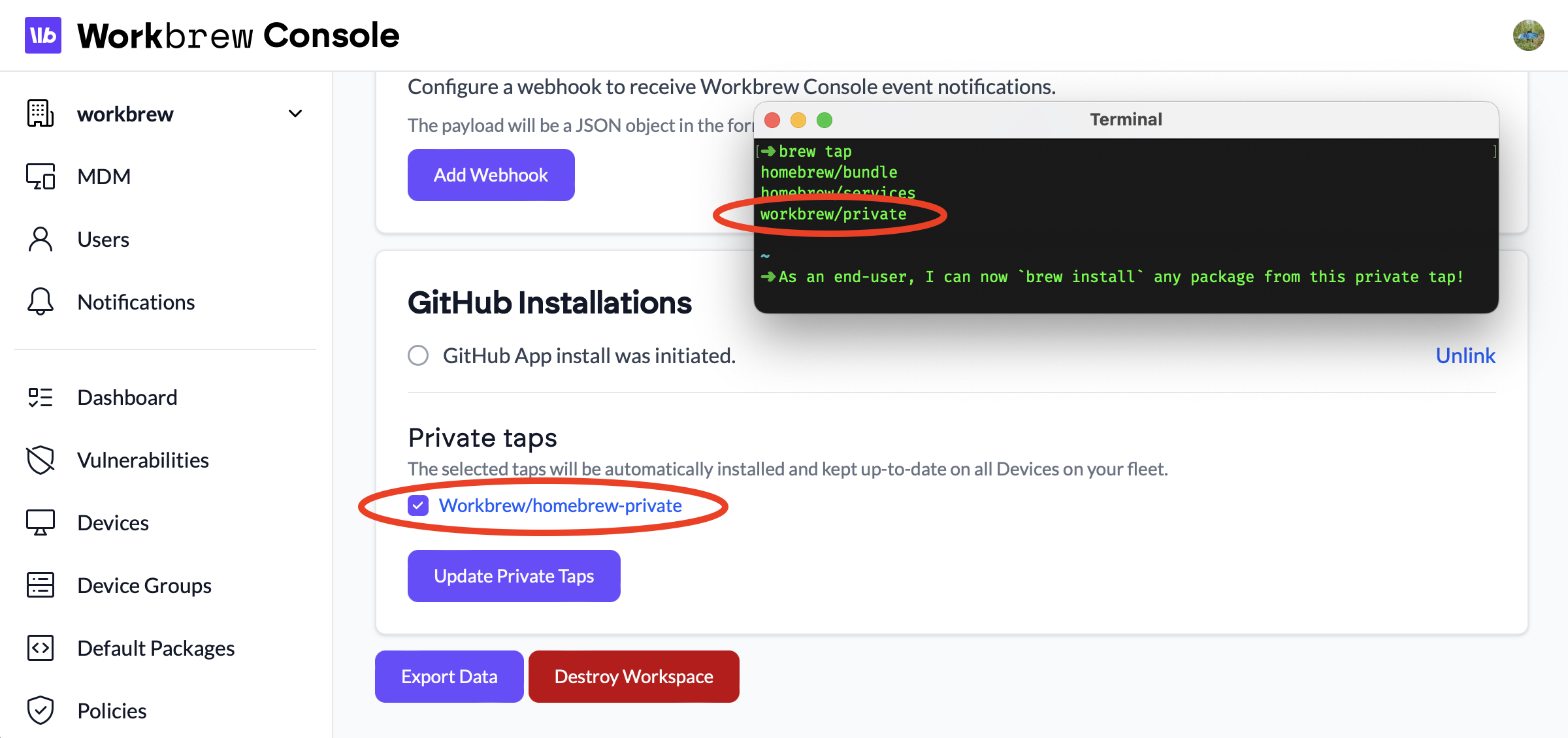 Simplify how your team accesses private taps and internal tools – no more token management juggling or need for unnecessary GitHub access. Just connect a private tap to your Workbrew workspace and all of your enrolled devices now have instant access to the internal software they need to be productive at work.