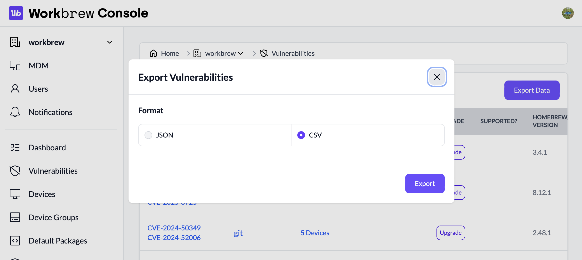 Need to analyze different types of Workbrew data across your fleet? Workbrew now supports exporting any page’s table data to JSON or CSV – so that you can gain instant access to critical data for reporting & compliance checks.
