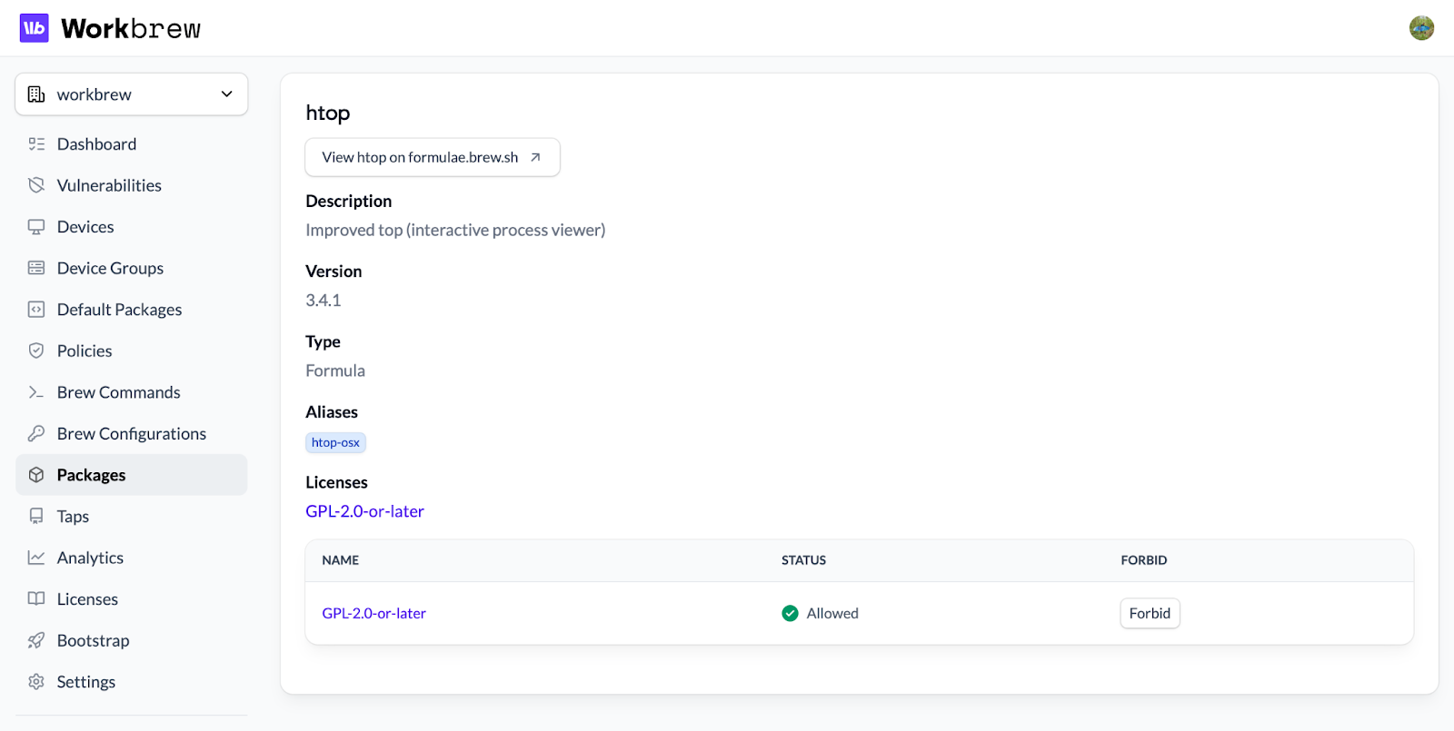 As Admins come across unknown or unvetted packages, Workbrew’s console surfaces key information: package descriptions, versions, licensing information, and more.
