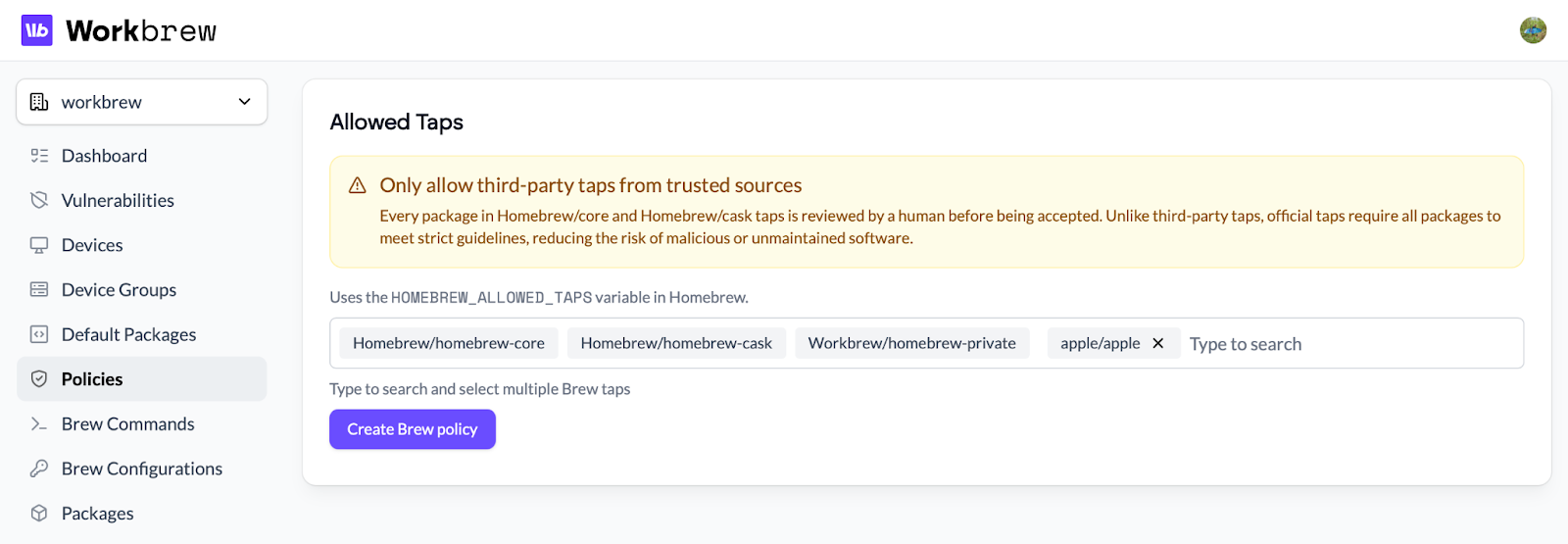 Automatically allow official Homebrew taps and any private taps connected to your Workbrew workspace.