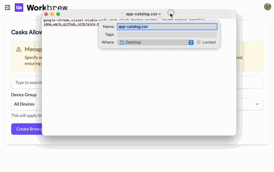 We’re back with another release packed with new features, refinements, and quality-of-life improvements. The headline in this release is Cask Allowlists - enabling admins to build a curated app catalog for optional desktop app installs. Alongside that, we’ve added more flexible policy management, richer device visibility, and fine-grained ways to integrate Workbrew into your workflows.