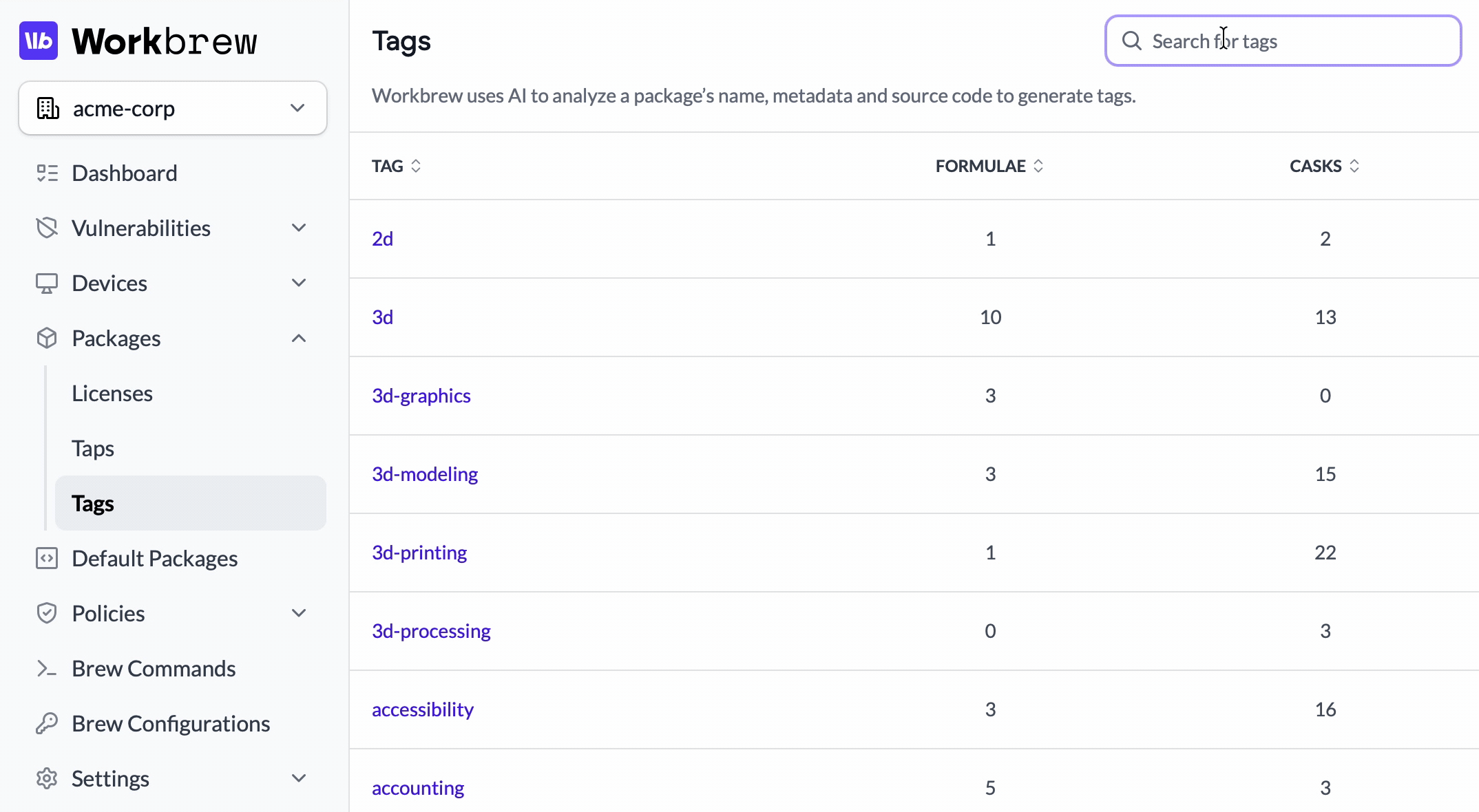 Workbrew now automatically tags every formula and cask in the catalog, synced directly into the Console. The catalog is fully searchable and sortable by tag. Click into a category and you can filter by all packages in that category, or narrow it down to just the ones installed across your fleet, with device counts so you know exactly how widely something is deployed. Click into any individual package and you’ll see every tag it’s been assigned, giving you the full picture before you make a call.